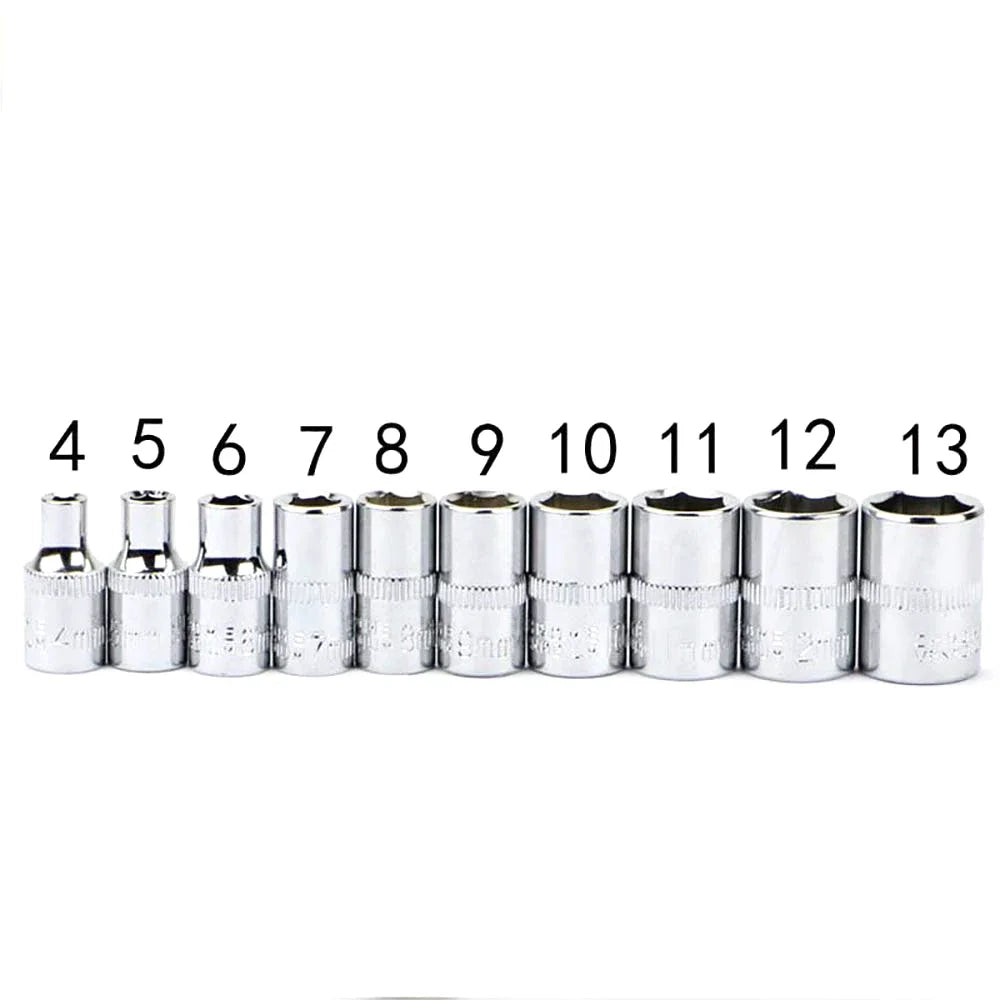 It includes metric sizes from 4mm to 13mm (4, 5, 6, 7, 8, 9, 10, 11, 12, 13mm), plus a 1/4" reversible ratchet handle.